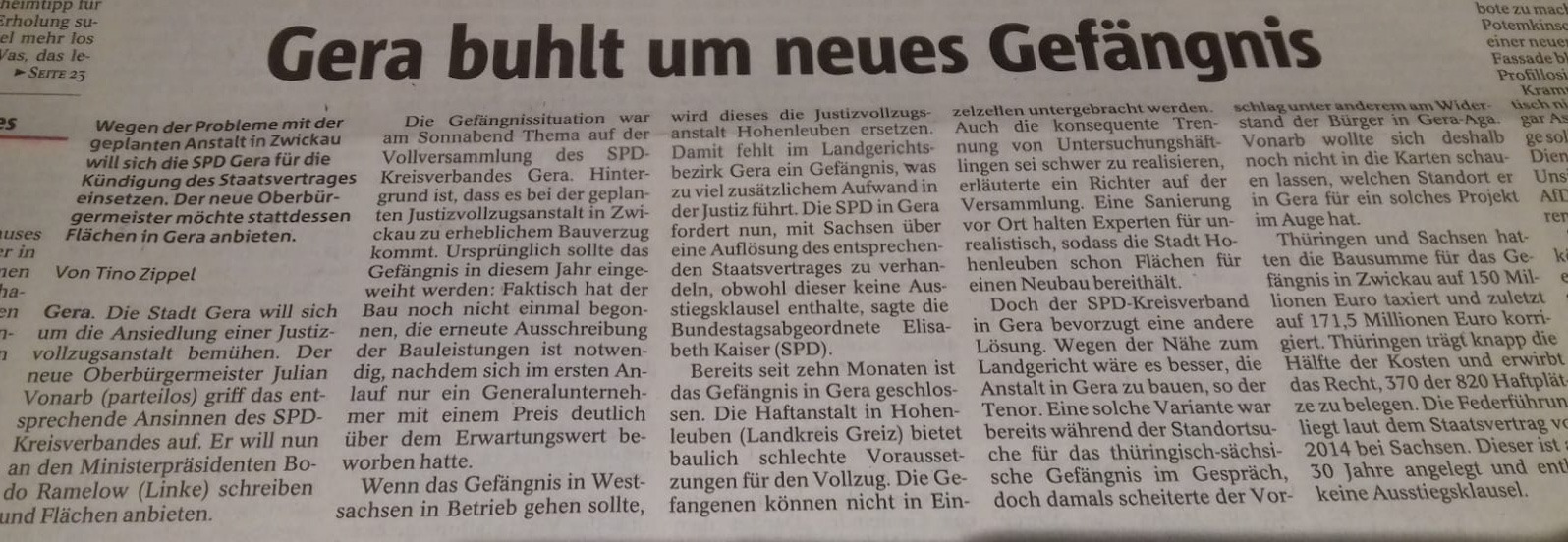Noch gibt es keine Entscheidung über einen möglichen eigenen Weg Thüringens in der Gefängnisfrage, doch langsam drängt die Zeit. Eigentlich hätte der Neubau in Zwickau bereits im kommenden Jahr eröffnen sollen. Nun ist fraglich, wann der Betrieb dort losgehen kann. Bei der Prüfung von Alternativen wurde laut Justizministerium auch das Angebot von Geras Oberbürgermeister Julian Vonarb (parteilos) «zur Kenntnis genommen und in die Prüfungen einbezogen.» Vonarb hatte vorgeschlagen, einen Standort in Gera für eine neue Thüringer Haftanstalt zu finden.