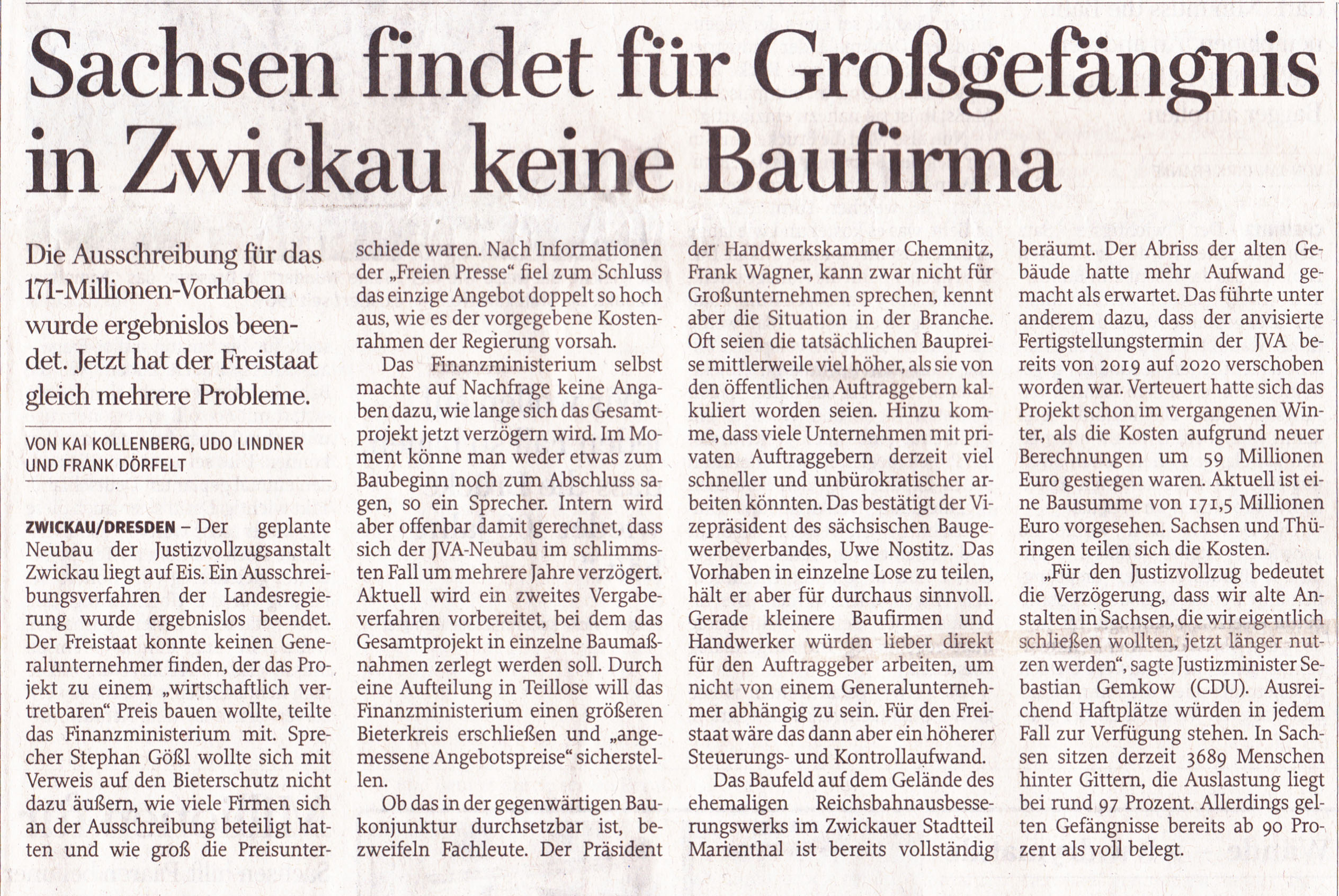 Im Juni hatte Sachsens Finanzministerium bekanntgegeben, dass die Ausschreibung für die Hauptbauarbeiten des neuen Gefängnisses aufgehoben worden sei. Es sei kein wirtschaftlich vertretbares Angebot eingegangen. Laut Ministeriumssprecher Stephan Gößl sollte ein neues Vergabeverfahren vorbereitet werden. Das steht aber derzeit noch aus. «Da wir uns entschlossen haben, Arbeiten als Einzellose auszuschreiben, ist noch Vorplanung nötig», sagte Gößl. Deshalb könne momentan auch nicht seriös Auskunft über die zu erwartenden zeitlichen Abläufe gegeben werden.