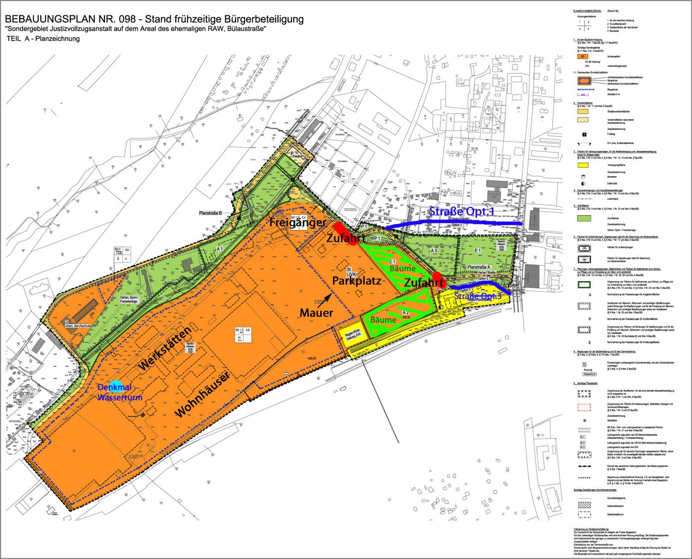 Ein Bebaungsplan (B-Plan) dient zur Schaffung von Baurecht. Also kann erst gebaut werden, wenn die Änderung in ein Sondergebiet rechtskräftig ist. Dazu wird im 1.Quartal 2015 der Stadtrat über den Änderungs- und Auslegungsbeschluss „Sondergebiet Justizvollzugsanstalt“ für das RAW-Gelände entscheiden. Nach dem Beschluss wird der neue Bebauungsplan 1 Monat lang im Bauplanungsamt (zuständig ist Herr Raußer) ausliegen. Im Rahmen der Bürgerbeteiligung könnt ihr dann alle Einwände, Bedenken und Vorschläge einbringen. Die dann wiederum dem Stadtrat vorzulegen sind. Auch jetzt schon könnt ihr eure Einwände mitteilen, deswegen ist hier nochmals zum ganz nahem Heranzoomen die PDF des B-Plans als Download.