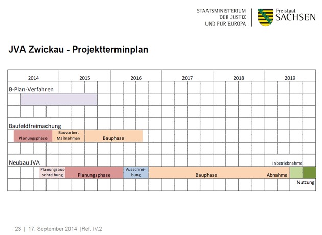 Während der Bürgerversammlung im September wurde folgendes mitgeteilt: Die JVA wird sich an der von Dresden orientieren. Richtung Bühlaustraße sollen die Werkshallen und Werkstätten sich orientieren, in Richtung Bahngleise die Wohngebäude. Das Freigängerhaus mit 90 Freigängern wird genau gegen über dem Friedhof am Wendehammer erichtet, dort wo die blaue gestrichelte Linie eine Ausbuchtung macht. Es wird 5 Stockwerke haben.